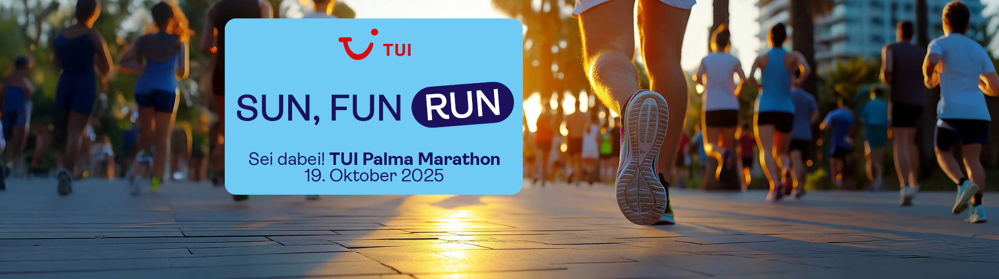 * TUI Palma Marathon (Event-Datum 19.10.2025) nur buchbar mit Hotelaufenthalt/Pauschalreise in der Region Mallorca. Begrenztes Kontingent. Buchbar bei TUI vom 10.04. bis 30.09.2025. Mindestalter zur Teilnahme: 18 J. für Marathon/Halbmarathon, 16 J. für 10-km-Lauf. Es gelten die regulären AGB und Stornobedingungen der Reisebuchung.