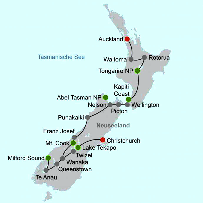Highlights: Herr der Ringe, Auckland, Rotorua, Tongariro Nationalpark, Kapiti Coast, Nelson, Abel Tasman Nationalpark, Franz Josef Gletscher, Queenstown, Milford Sound, Te Anau, Mount Cook, Christchurch