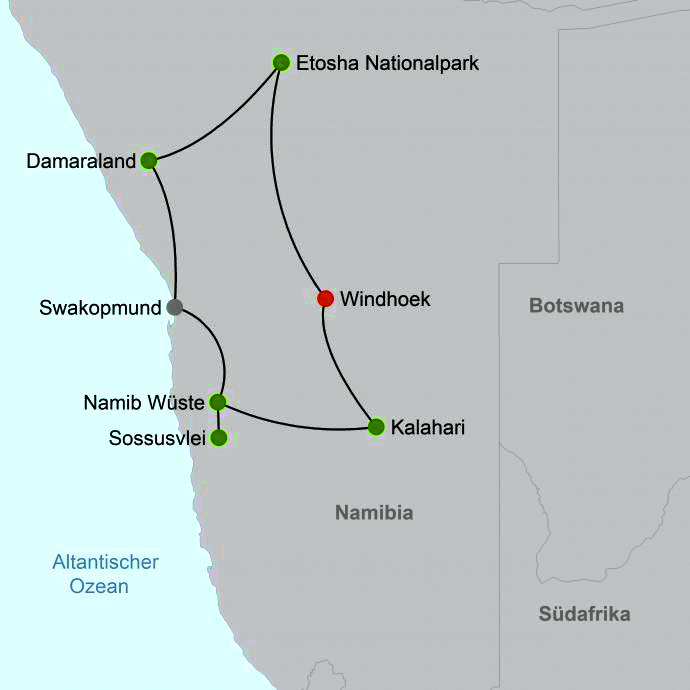 Highlights: Seele der Welt: Kalahari Wüste, schönes Farbenspiel: Sossusvlei am Morgen, Swakopmund, UNESCO Weltkulturerbe: Felszeichnungen Twyfelfontein, Etosha Nationalpark