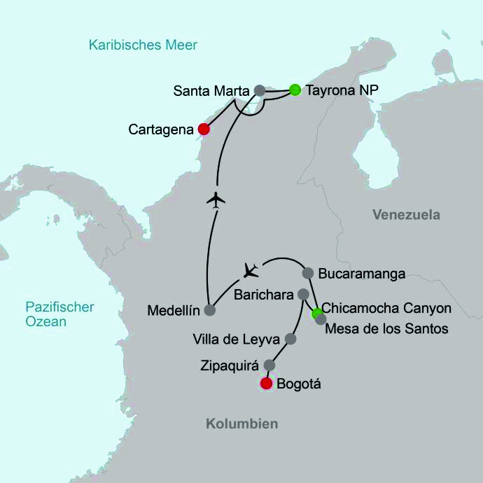 Highlights: Bogotá, Zipaquirá, Villa de Leyva, Barichara, Mesa de los Santos, Medellín, Santa Marta, Nationalpark Tayrona, Cartagena