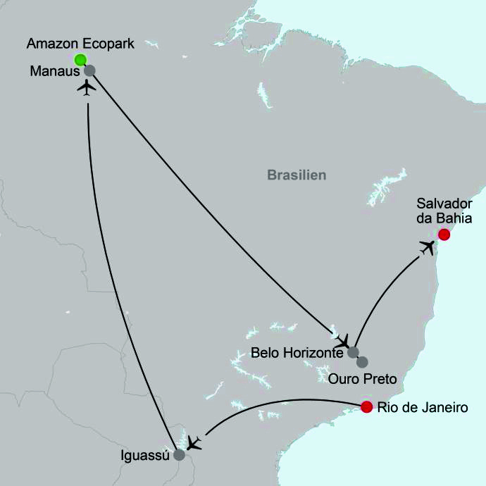 Tauchen Sie ein in eine Kleingruppenreise voller Highlights von Rio de Janeiro bis nach Salvador da Bahia. Neben dem Naturwunder des Amazonas-Regenwaldes und den atemberaubenden Wasserfällen von Iguassú warten besondere Reiseerlebnisse auf Sie – sowohl kulinarisch bei einem Churrasco-Dinner oder bei einem Kaffee mit Pão de Queijo als auch kulturell. Bei einem Besuch eines Caboclo Hauses am Amazonas lernen Sie das einheimische Leben am Fluss hautnah kennen.