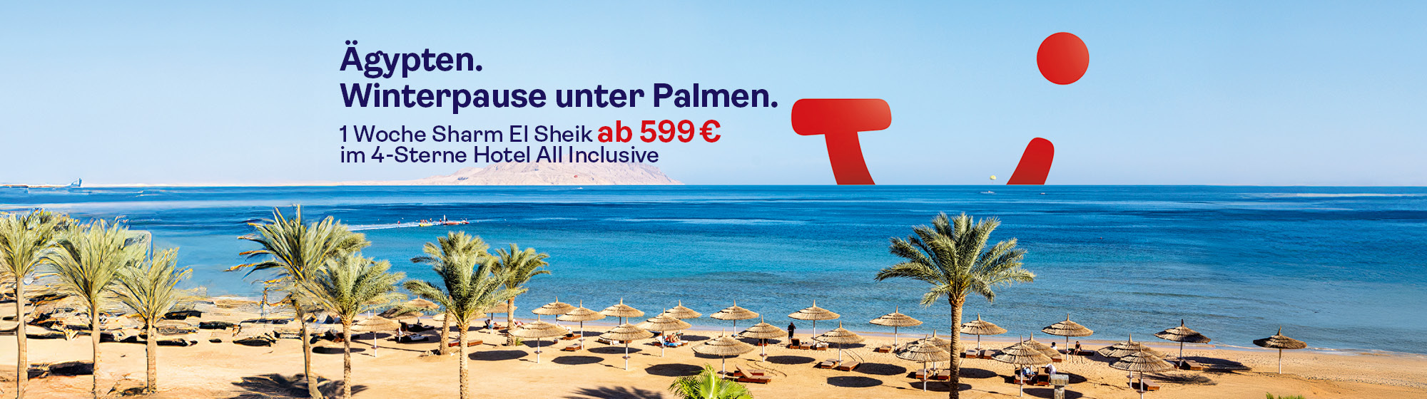 Majestätische Pyramiden entdecken, über orientalische Basare flanieren, Wüstenabenteuer erleben und an feinsandigen Stränden entspannen – eine Auszeit am Roten Meer ist so facettenreich wie unvergesslich. Die milden Temperaturen und zahlreichen Sonnenstunden machen die Region gerade auch im Winter zu einem reizvollen Urlaubsziel. Bequeme Anreise gewünscht? Dann buchen Sie eine Direktverbindung, z. B. mit TUI fly neu ab November von Düsseldorf oder Frankfurt nach Sharm El Sheikh. Hier genießen Sie z. B. 1 Woche ab 599€* pro Person im 4-Sterne Hotel mit All Inclusive-Verpflegung.