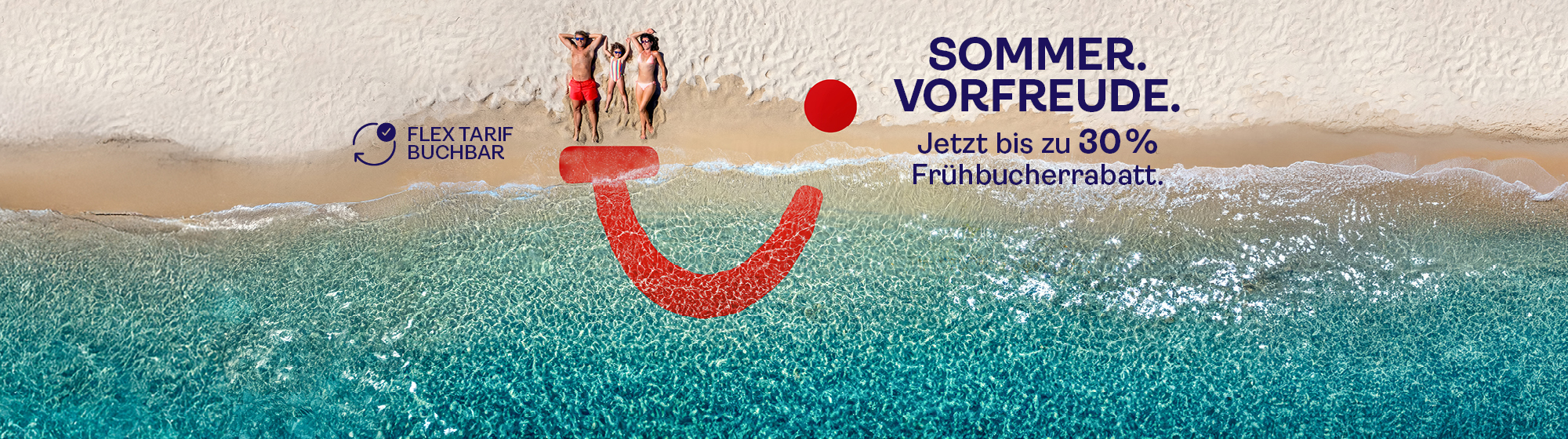 Buchen Sie jetzt schon Ihren Sommerurlaub 2026 und sichern sich dabei bis zu 30% Frühbucherrabatt*. Mit dem zusätzlichen Flex Tarif können Sie zudem flexibel umbuchen oder stornieren. Ob eine Reise an die Traumstrände Asiens, ein Wanderurlaub in die Berge oder ein All Inclusive Urlaub am schönen Mittelmeer, TUI hat für jeden den passenden Urlaub! Wer früh bucht, spart und sichert sich die besten Zimmer!