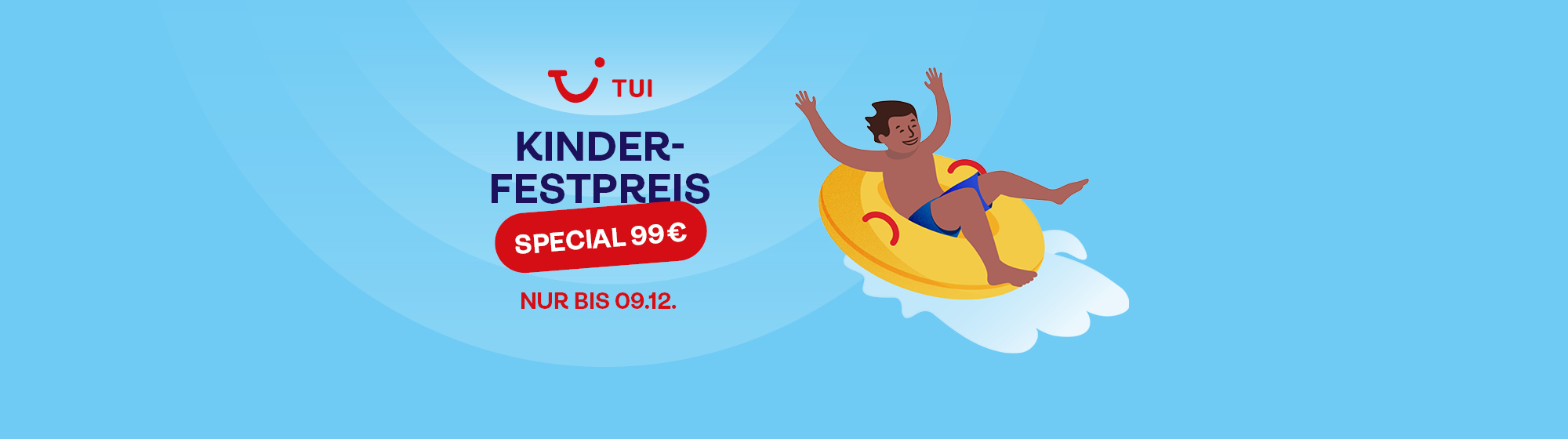 * Die Preise des TUI Kinderfestpreis-Specials gelten für Kinder von 2-12 Jahren im Zimmer zweier Vollzahler für Pauschalreisen an ausgewählten Terminen vom 01.05. bis 30.09.26 (letzte Rückreise) in teilnehmenden Hotels für 7-14 Nächte, inkl. Basisverpflegung mit ausgewählten Flügen. Begrenztes Kontingent, buchbar vom 04. – 09.12.25 (TUI oder airtours).